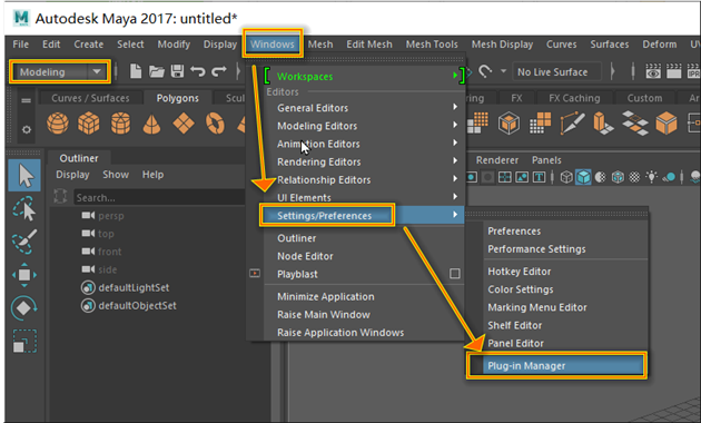 ①在Modeling模式下,菜单栏中单击 Windows(窗口)——Settings/Preferences(设置/首选项)——Plug-in Manager(插件管理器),单击打开“插件管理”窗口