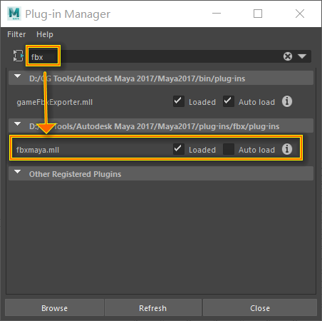 ②打开“插件管理”窗口后,输入 fbx 回车搜索 搜索出来的结果中,在 fbxmaya.mll 项的 后面,Loaded 处单击打钩,然后单击右下角的 close 按钮关闭当前窗口,然后maya就可以拖入/导入fbx模型文件啦(无需重启Maya软件)