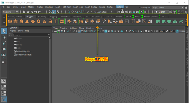 (Maya工具架中不同的选项卡中,有不同组的命令图标)