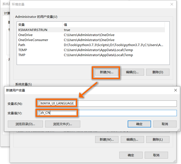 ☆改为中文则依次输入: 变量名:MAYA_UI_LANGUAGE 变量值:zh_CN