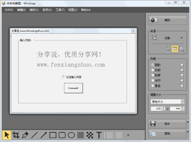WinSnap v5.27 (截屏工具)免安装, 是一款完全免费的屏幕捕获、截图截屏软件,可以独立运行的实用小工具,能够让您得心应手地捕获到需要的屏幕截图。捕获图像方式灵活,主要可以捕获整个屏幕、活动窗口、选定区域等,图像输出方式多样,主要包括剪贴板、文件和邮件。软件截图后可以自定义添加文字、箭头、矩形、圆形、打马赛克,具有自定义捕获热键、设置捕获前延时、图像文件自动按时间或模板命名、捕获成功声音提示、预览捕获图片、图像打印、图像水印、图像反色、图像翻转、图像旋转等功能。捕获到的图像能够以保存图像文件、复制到剪贴板等多种方式输出。