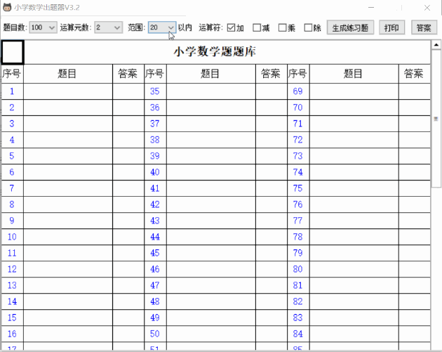 小学数学出题器 (可打印)v3.2,免安装版程序,可以解决您在家给孩子出小学数学计算题目练习找不到合适题目内容的烦恼。
