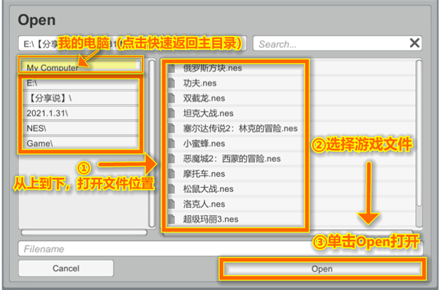 1、支持nes、zip游戏格式文件(功能位置,菜单栏:文件—打开)